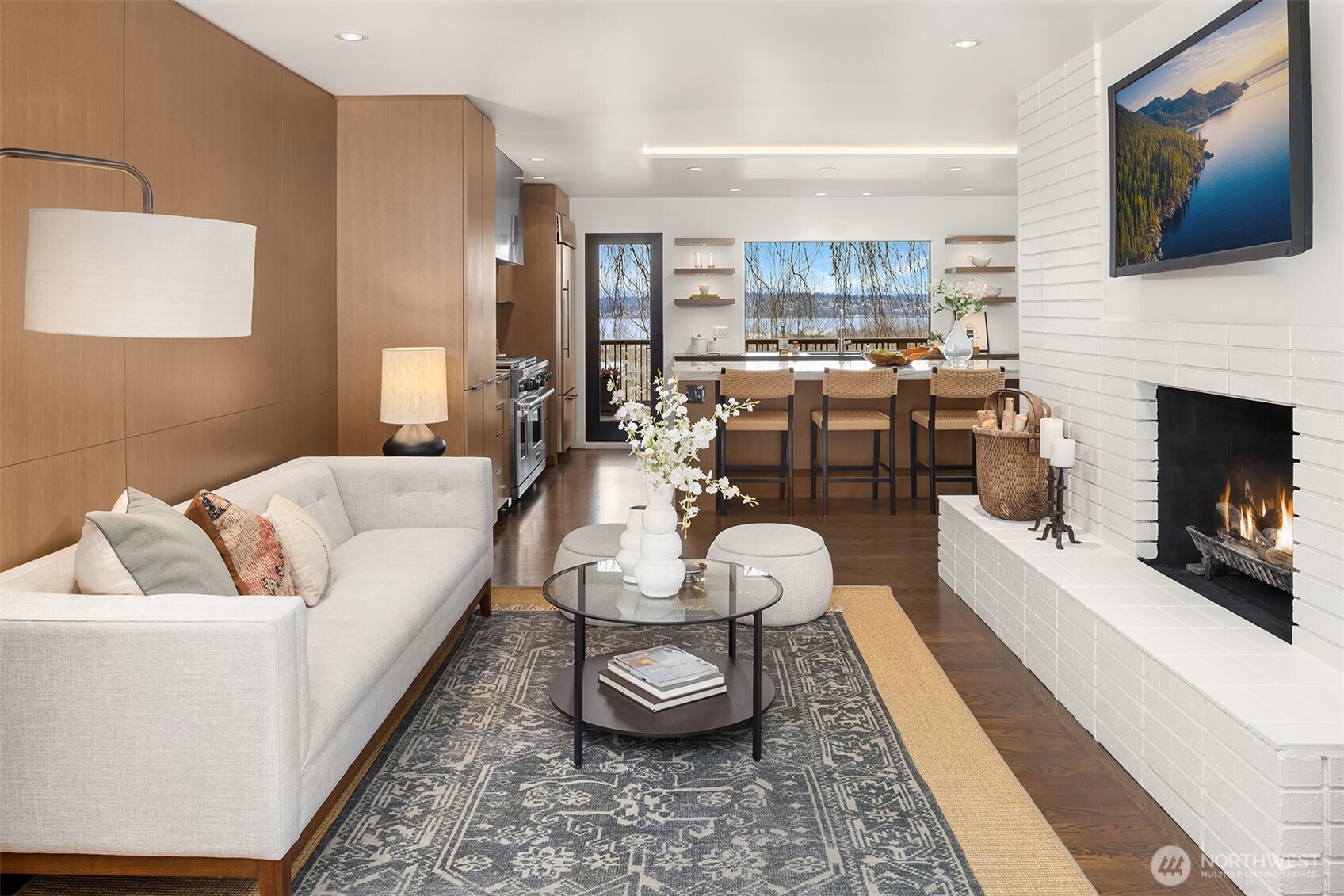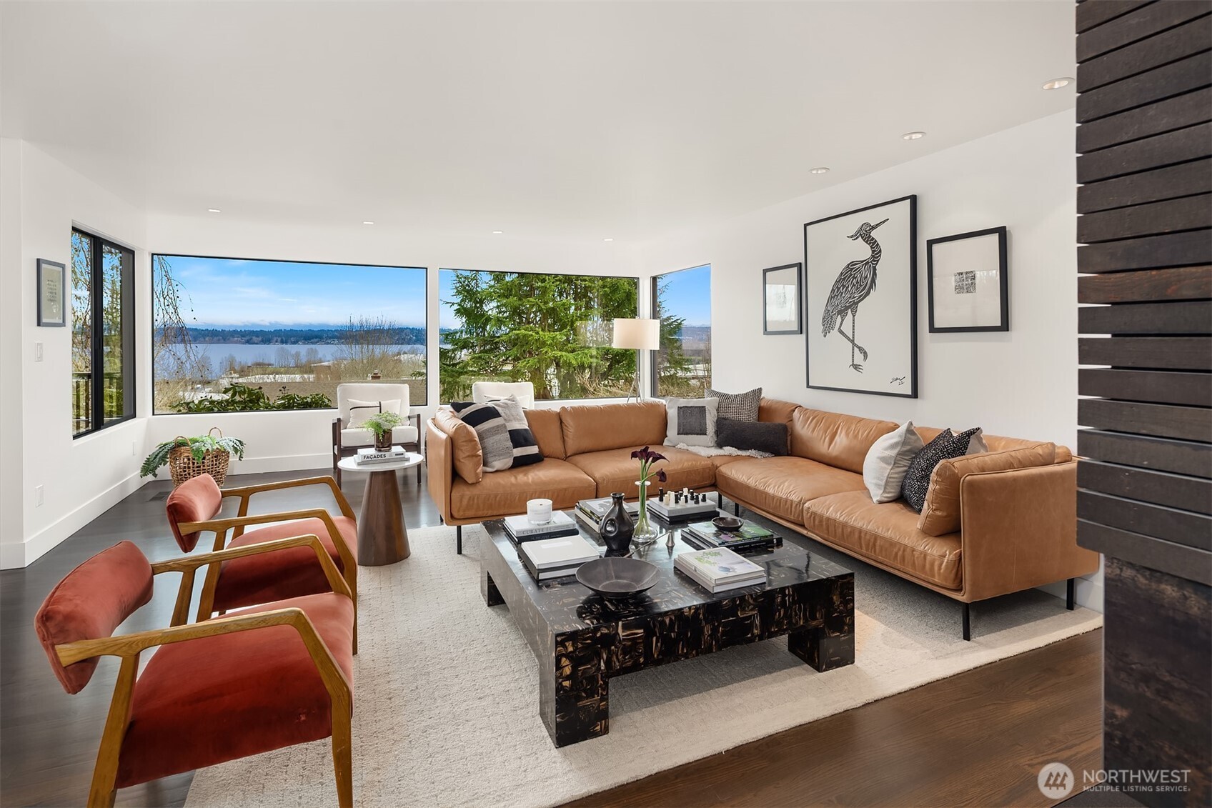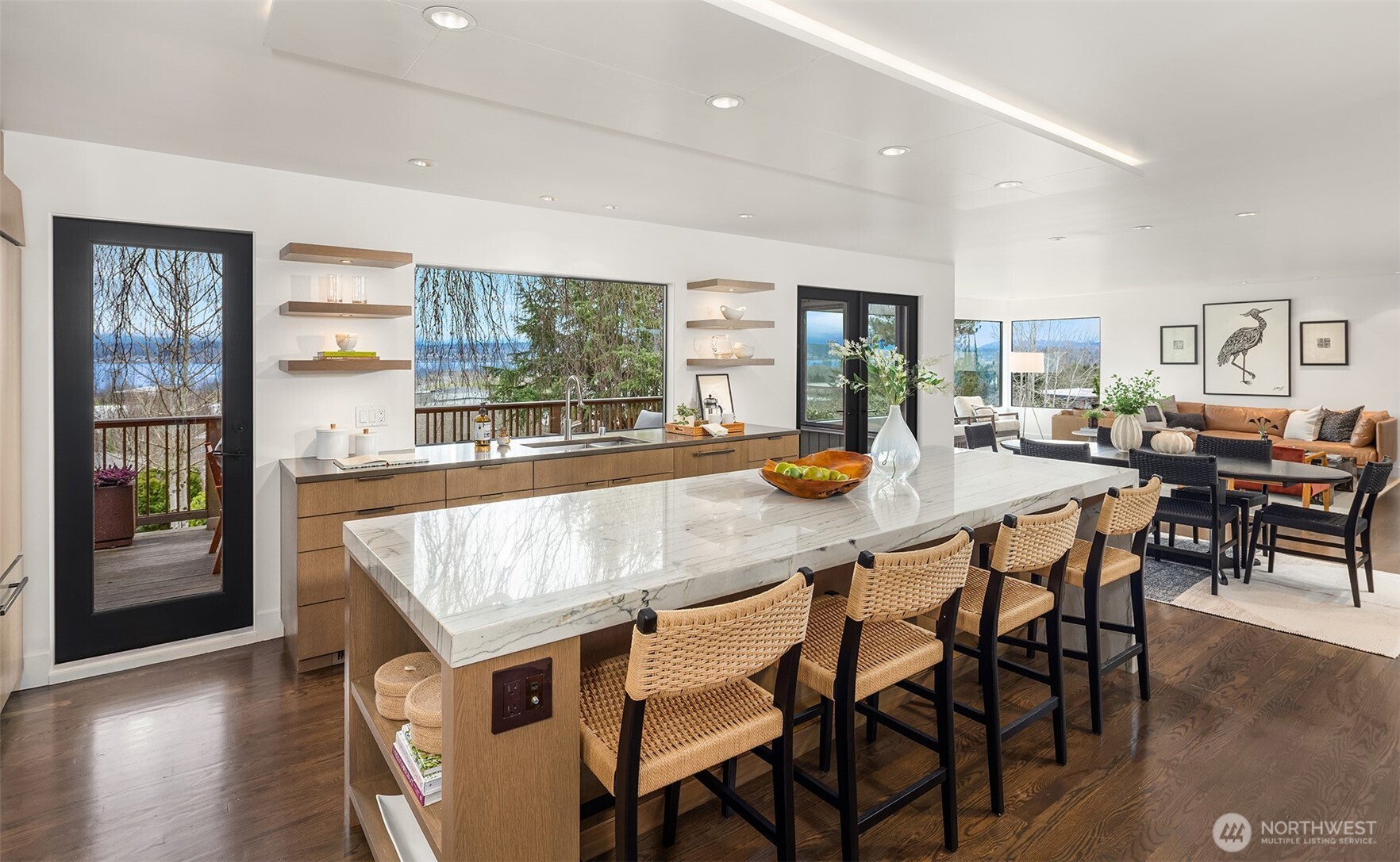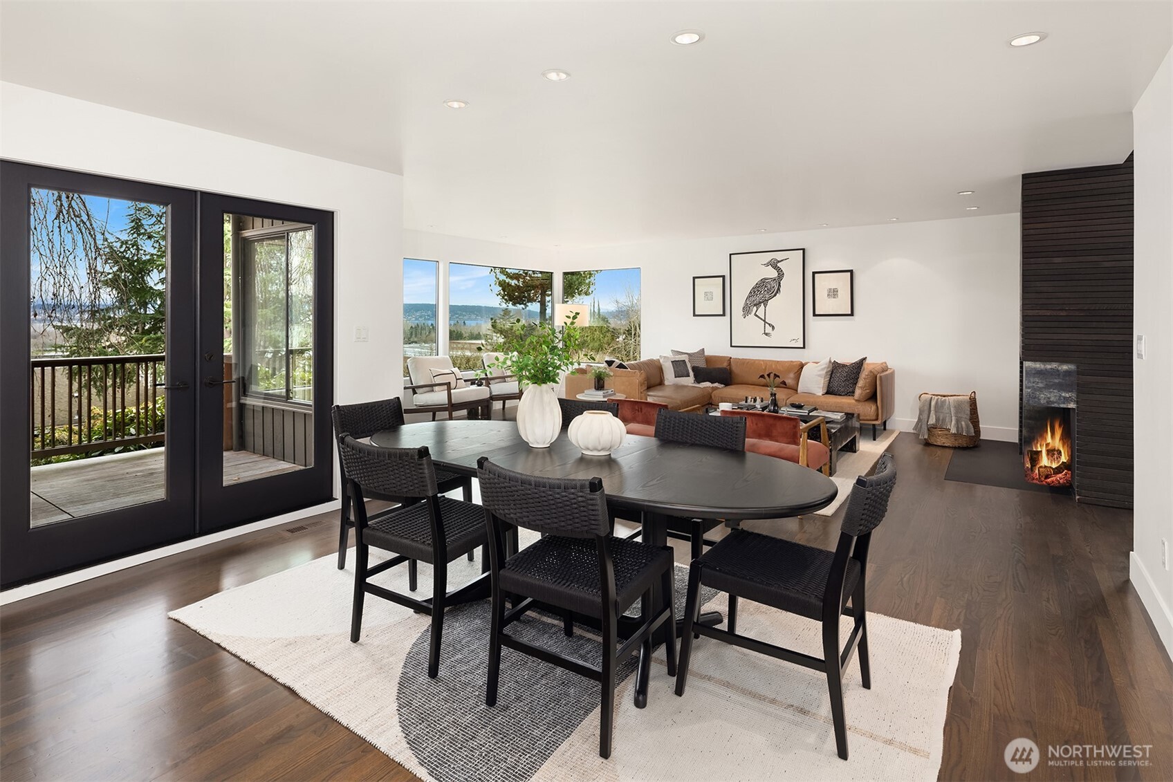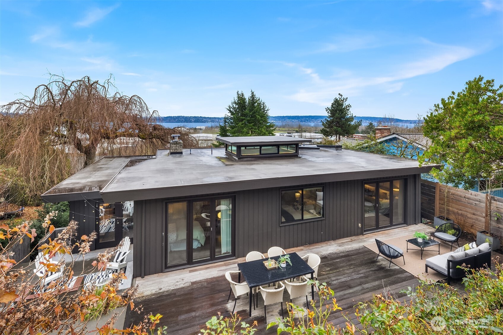 Perched above the water in the hillside like a private coastal retreat, this View Ridge stunner channels pure Laguna Beach cool--where walls of glass, warm woods, and endless blue views steal the show. Originally designed and built in 1964 and then renovated to the studs and expanded in 2012, this 4 Bed, 3 Bathrooms home reflects the clean lines and seamless indoor-outdoor philosophy that defines the timeless appeal of modernism. Every system is upgraded and finishes are elevated for contemporary living--creating a rare blend of mid-century pedigree and modern refinement. A sleek chef's kitchen w/waterfall marble island, custom cabinetry, flows effortlessly into airy dining and lounge spaces wrapped in panoramic windows. Four fireplaces create intimate moments throughout, while expansive French doors open to Ipe decks and patios tucked into lush, terraced landscaping. The primary suite is soft, serene & connected to a private outdoor retreat. Downstairs living spaces offer flexibility for media, guests or creative studio space. From sunrise coffee on the decks to golden hours entertaining, rooms are intentionally positioned to capture light, water, and Cascade mountains. Pro grade appliances--Wolf Oven/Range, Subzero Fridge. In floor heating in all bathrooms and lower level. New back patio, Gas BBQ hookup, French drains, and sprinklers. Fireplaces plumbed for gas, but burn real wood. New water heater in 2023.